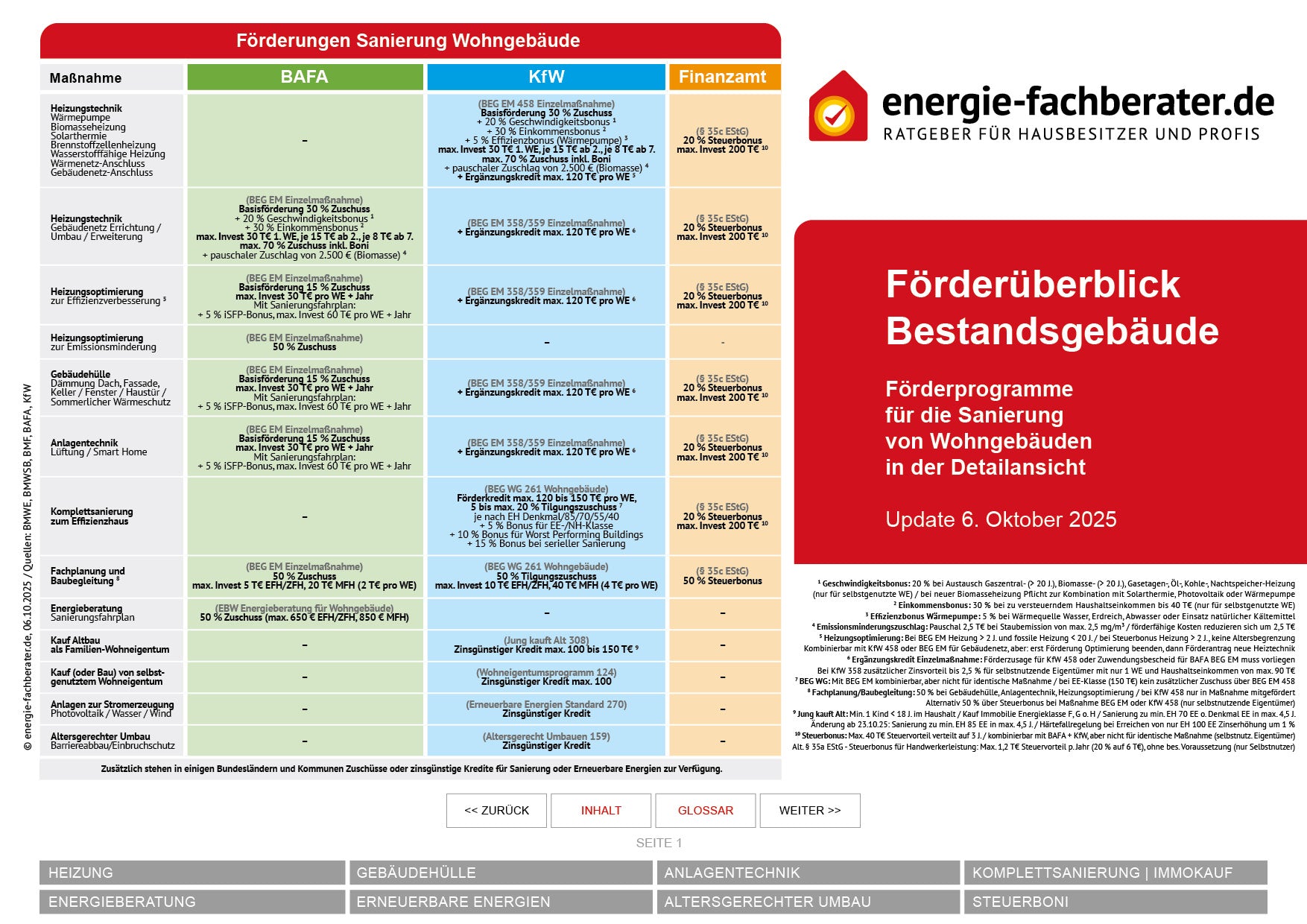 Du möchtest einen Komplettüberblick über alle Fördermittel inkl. der wichtigsten Förderbedingungen und Links zu den weiterführenden Seiten bei den Fördergebern? Und das für alle Sanierungsmaßnahmen in einem Dokument und immer auf aktuellem Stand?